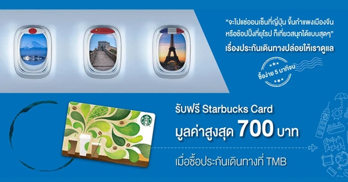 ซื้อประกันเดินทางที่ TMB ง่ายๆ แค่ 5 นาทีจบ พร้อมรับฟรี! Starbucks Card มูลค่าสูงสุด 700 บาท เมื่อซื้อประกันเดินทางที่ TMB