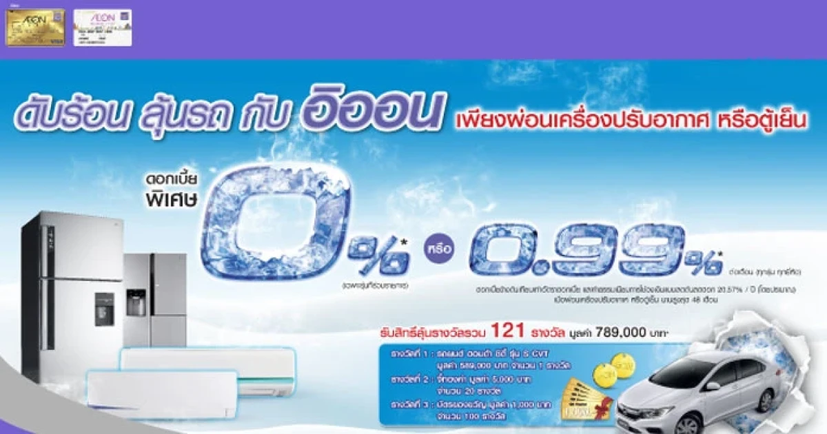 ดับร้อน ลุ้นรถ กับอิออน เพียงผ่อนเครื่องปรับอากาศ หรือตู้เย็น รับดอกเบี้ยพิเศษ 0% เฉพาะรุ่นที่ร่วมรายการ หรือ 0.99% ต่อเดือน ทุกรุ่น ทุกยี่ห้อ