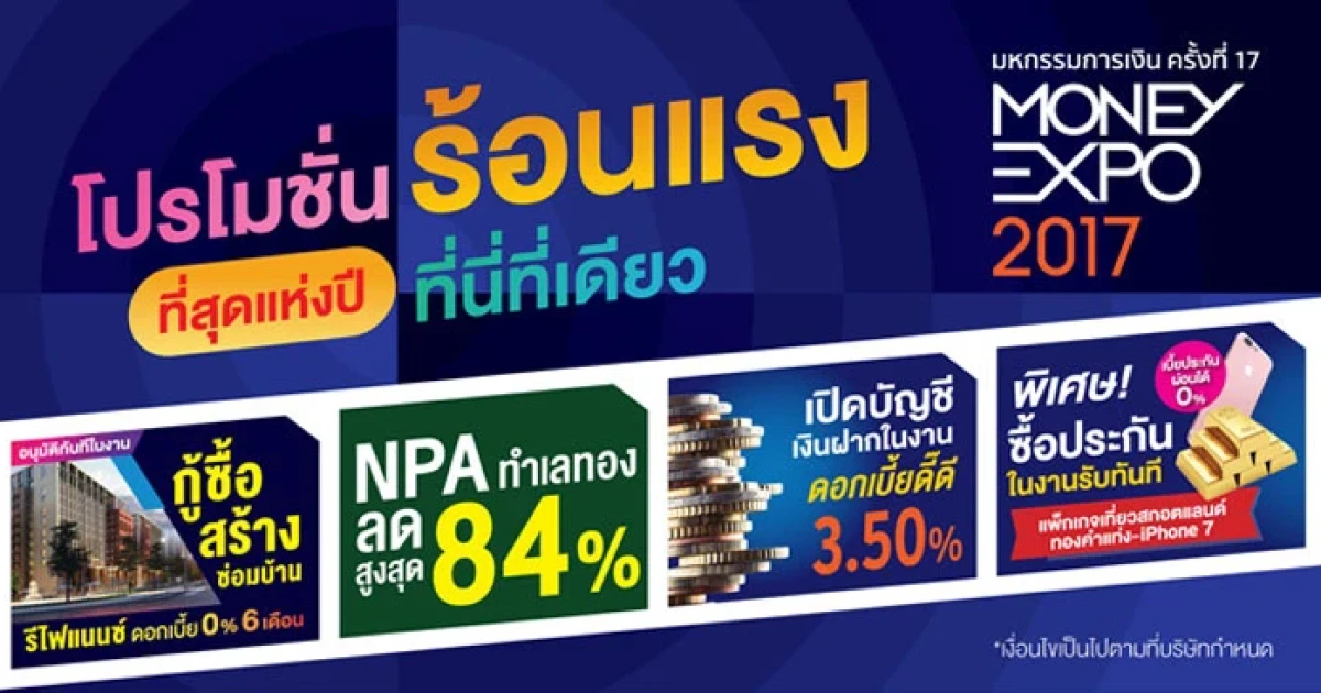 มหกรรมการเงิน ครั้งที่ 17 Money Expo 2017 ในครั้งนี้มีบริการทางการเงินและการลงทุนอย่างครบวงจรจากธนาคารและสถาบันการเงินที่เข้าร่วมงาน ซึ่งได้แข่งขันกันนำแคมเปญโปรโมชั่นพิเศษสุดในรอบปี ทั้งสิทธิประโยชน์ที่ดีที่สุด ดอกเบี้ยเงินกู้ที่ต่ำที่สุด และผลตอบแทนที่คุ้มค่าที่สุด รวมไปถึงการลุ้นรางวัลชิงโชค ของแจก ของแถมอีกมากมาย