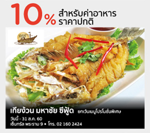 รับส่วนลด 10% สำหรับค่าอาหารราคาปกติ ที่ร้านเกียง้วน มหาชัย ซีฟู้ด, ชายทะเลบางพระ และครัวยกทะเล