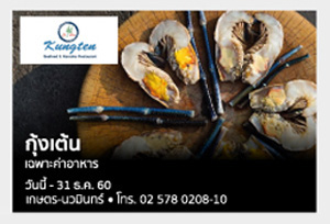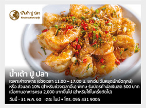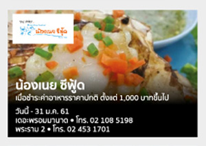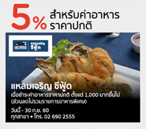 รับส่วนลด 5% สำหรับค่าอาหารราคาปกติ ที่ร้านแหลมเจริญ ซีฟู้ด, น้องเนย ซีฟู้ด, อ่าวกระเบน ซีฟู้ด และ กุ้งเต้น
