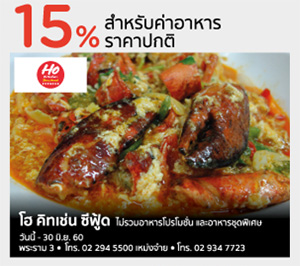 รับส่วนลด 15% สำหรับค่าอาหารราคาปกติ ที่ร้านโฮ คิทเช่น ซีฟู้ด, น้ำเต้าหู้ ปู ปลา และเดอะ คอคเคิล