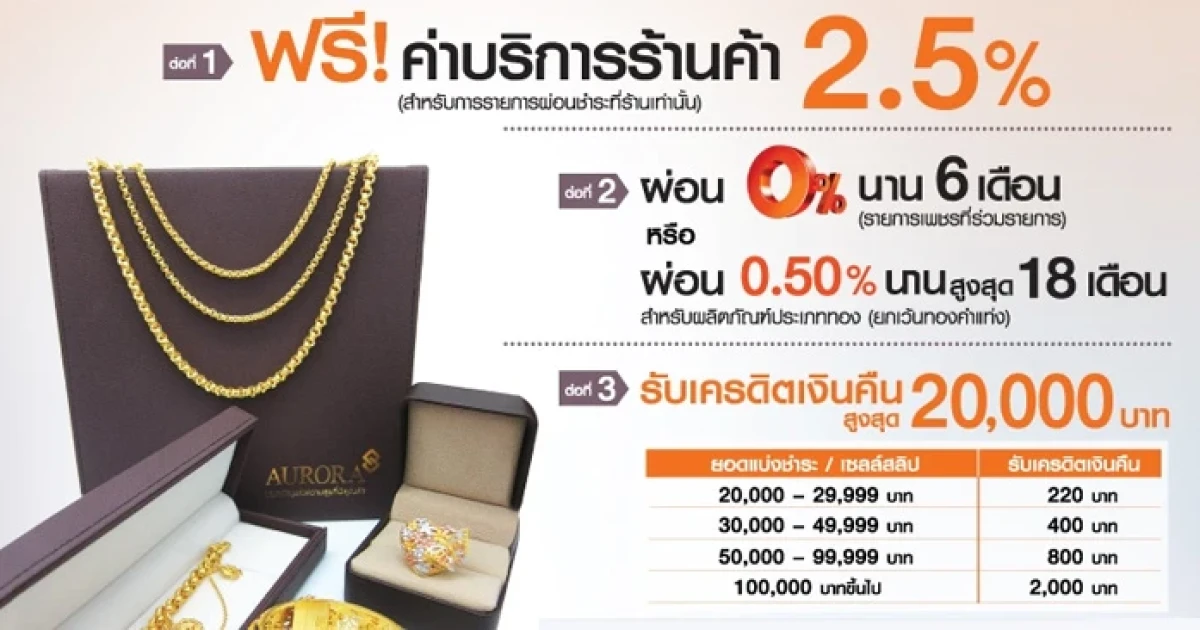 ผ่อนทอง 0% ฟรีค่าบริการ 2.5% พร้อมรับเงินคืนสูงสุด 20,000 บาท ณ ห้างทองออโรร่า จากบัตรฯ ธนชาต