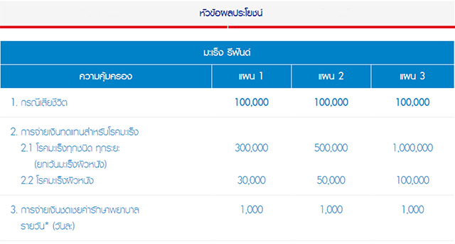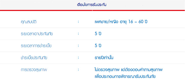 หมายเหตุ : รายละเอียดข้างต้นนี้เป็นเพียงการสรุปผลประโยชน์โดยสังเขปและขอสงวนสิทธิ์ในการพิจารณารับประกันตามหลักเกณฑ์ของบริษัทฯ ทั้งนี้เงื่อนไขและความคุ้มครอง อย่างสมบูรณ์จะถูกระบุอยู่ในกรมธรรม์ที่ท่านซื้อไว้เท่านั้น