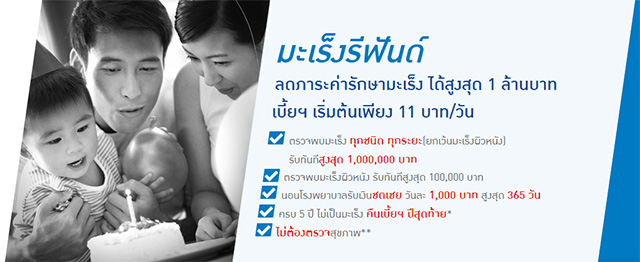 "มะเร็ง ห้ามไม่ได้... แต่เตรียมค่ารักษาได้" บริษัท ไทยประกันชีวิต จำกัด (มหาชน) ได้ตระหนักถึงความสำคัญในการเตรียมความพร้อมสำหรับค่าใช้จ่ายในการรักษาโรคมะเร็ง จึงได้พัฒนาแบบประกัน "มะเร็ง รีฟันด์" ขึ้นมา เพื่อเป็นทางเลือกในการสร้างหลักประกันชีวิตและโรคมะเร็ง ช่วยคลายความกังวลกับค่าใช้จ่ายในการรักษาพยาบาลที่อาจจะเกิดขึ้นได้