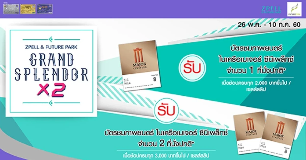 รับฟรี! บัตรชมภาพยนตร์ในเครือเมเจอร์ ซีนีเพล็กซ์ สูงสุด 2 ที่นั่ง เมื่อสะสมยอดใช้จ่ายที่ศูนย์การค้าฟิวเจอร์พาร์ค รังสิต และศูนย์การค้าสเปลล์ ตามยอดที่กำหนด ผ่านบัตรเครดิตอิออน