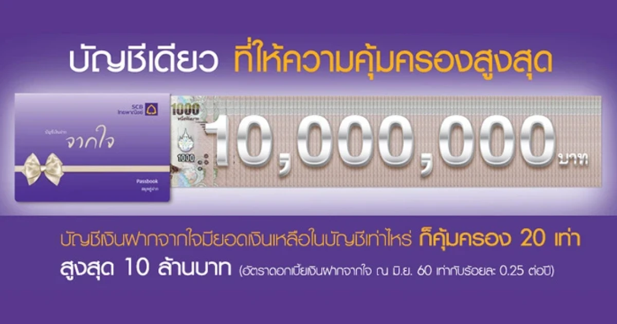 บัญชีเงินฝากจากใจ จากธนาคารไทยพาณิชย์ มอบความคุ้มครองชีวิตจากอุบัติเหตุ 20 เท่า* สูงสุด 10 ล้านบาท ทันทีที่สมัคร