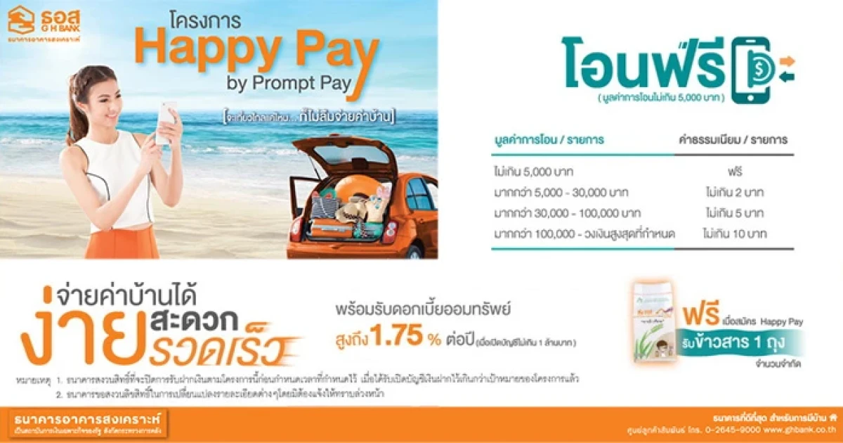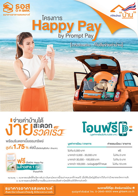 ธนาคารอาคารสงเคราะห์ (ธอส.) จัดทำโครงการ Happy Pay by PromptPay เพื่อเพิ่มความสะดวกในการชำระเงินงวด ค่าบ้าน เพียงเปิดบัญชีเงินฝากออมทรัพย์ Happy Home ธอส.พร้อมสมัคร PromptPay เพื่อหักบัญชีชำระหนี้เงินกู้ ทั้งนี้ลูกค้าสามารถโอนเงินจากบัญชีเงินฝากธนาคารใดก็ได้มาที่บัญชีเงินฝากออมทรัพย์ Happy Home (กรณีโอนด้วยบัญชี PromptPay ไม่เกิน 5,000 บาทต่อรายการจะไม่เสียค่าธรรมเนียม)