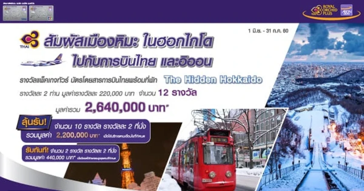 สัมผัสเมืองหิมะในฮอกไกโด ไปกับการบินไทยและอิออน ลุ้นรับแพ็คเกจทัวร์ญี่ปุ่น บัตรโดยสารสายการบินไทยพร้อมห้องพัก (The Hidden Hokkaido) รวมมูลค่าของรางวัลกว่า 2 ล้านบาท เมื่อมียอดใช้จ่ายสะสมผ่านบัตรเครดิตอิออน รอยัล ออร์คิด พลัส แพลทินัม