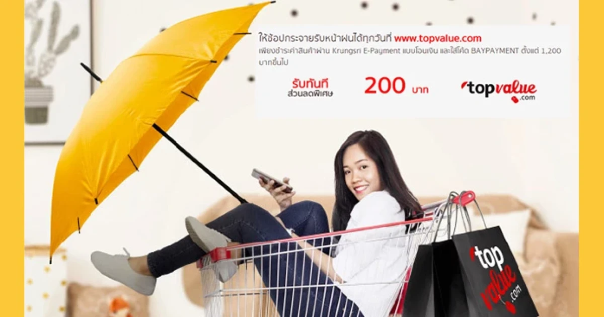 ธนาคารกรุงศรีอยุธยา ให้คุณช้อปกระจายรับหน้าฝนได้ทุกวันที่ www.topvalue.com เพียงชำระค่าสินค้าผ่าน Krungsri E-Payment แบบโอนเงิน และใส่โค้ด BAYPAYMENT ตั้งแต่ 1,200 บาทขึ้นไป รับทันที่ ส่วนลดพิเศษ 200 บาท