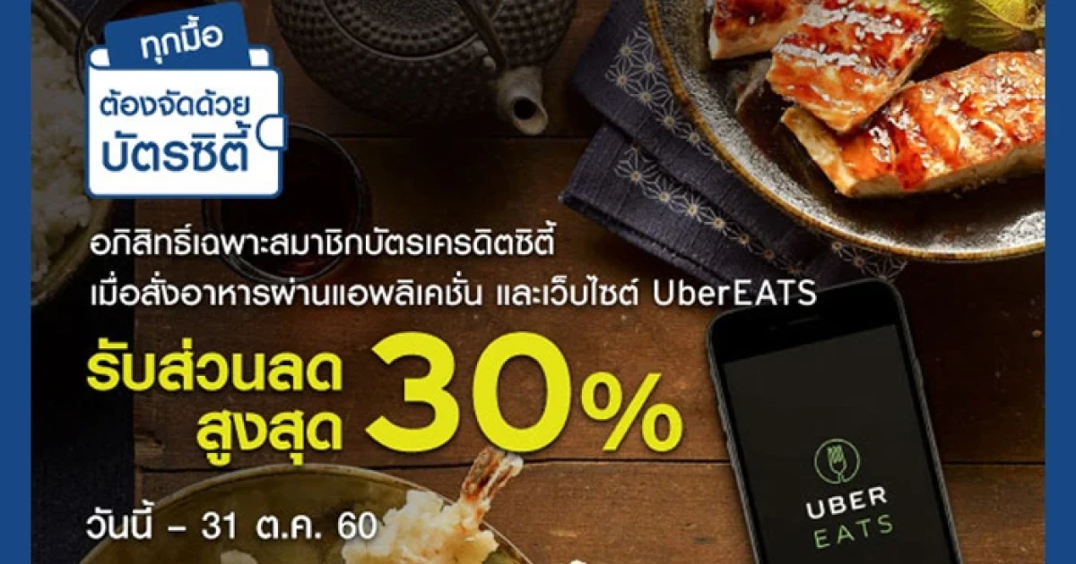 รับส่วนลดสูงสุด 30% เมื่อสั่งอาหารผ่านแอปพลิเคชั่น และเว็บไซต์ UberEATS และชำระผ่านบัตรเครดิตซิตี้