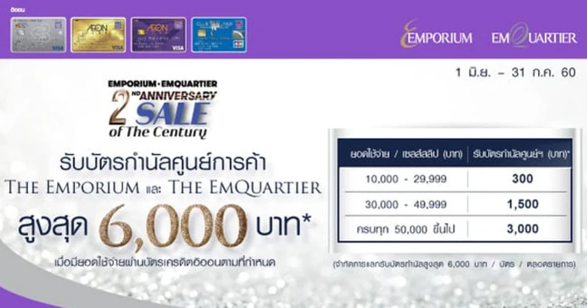 Sale of The Century 2017 รับบัตรกำนัลห้างฯ สูงสุด 6,000 บาท เมื่อช้อปที่ The Emporium และ The Emquartier ตั้งแต่ 10,000 บาทขึ้นไป/ เซลล์สลิป ผ่านบัตรเครดิตอิออน