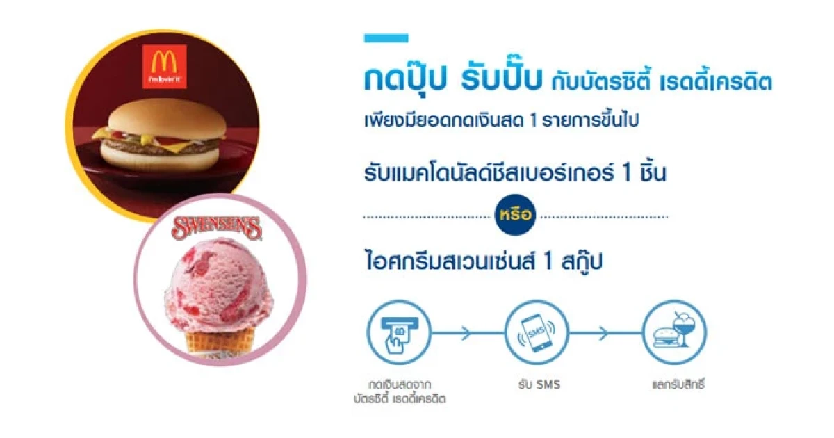 กดปุ๊ป รับปั๊บ กับบัตรซิตี้ เรดดี้เครดิต เพียงมียอดกดเงินสด 1 รายการขึ้นไป รับแมคโดนัลด์ชีสเบอร์เกอร์ 1 ชิ้น หรือ ไอศกรีมสเวนเซ่นส์ 1 สกู๊ป