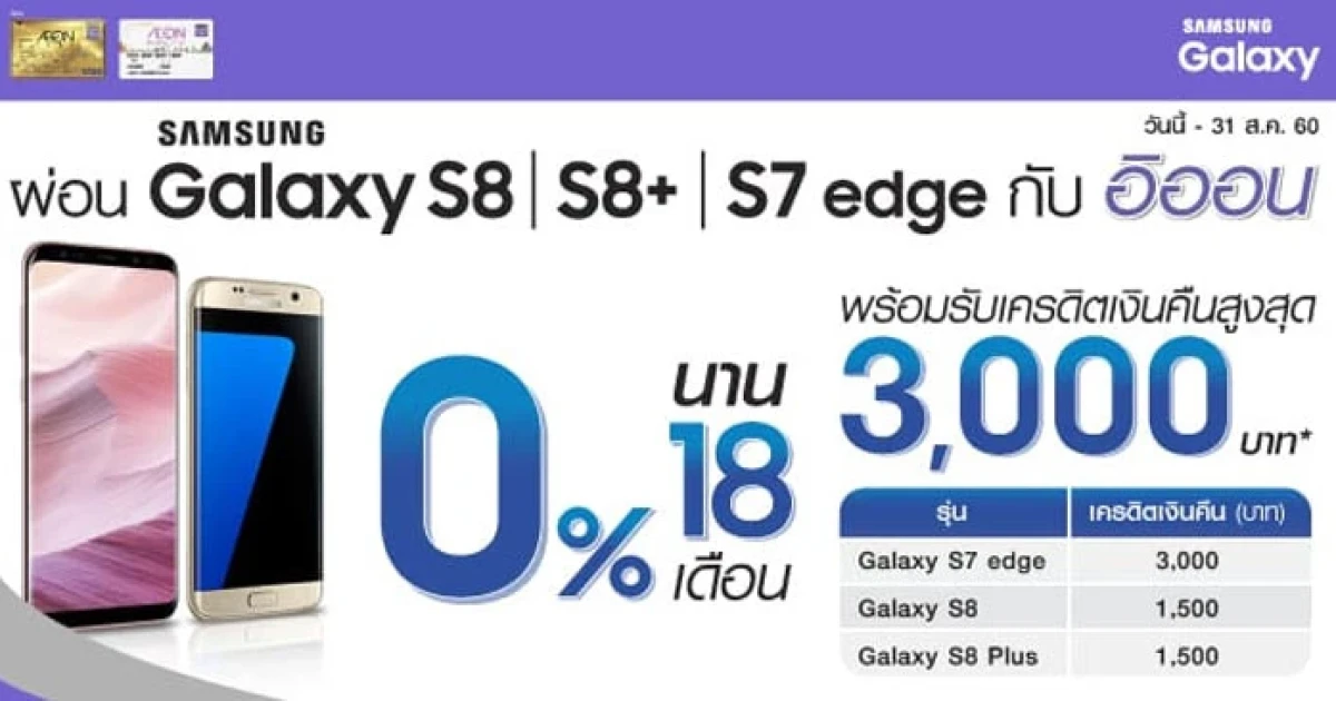 - ผ่อนโทรศัพท์มือถือ SAMSUNG GALAXY S8 & S8Plus 0% นาน 18 เดือน ตั้งแต่วันที่ 17 กรกฎาคม - 31 สิงหาคม 2560 รับเครดิตเงินคืน 1,500 บาท