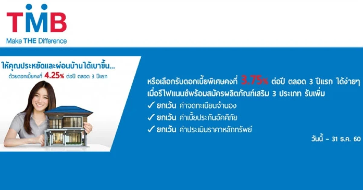 มารีไฟแนนซ์บ้านกับ TMB สิ ดอกเบี้ยต่ำ แถมไม่มีค่าธรรมเนียมใดๆ เมื่อสมัครพร้อมผลิตภัณฑ์เสริม 3 ประเภท ได้แก่