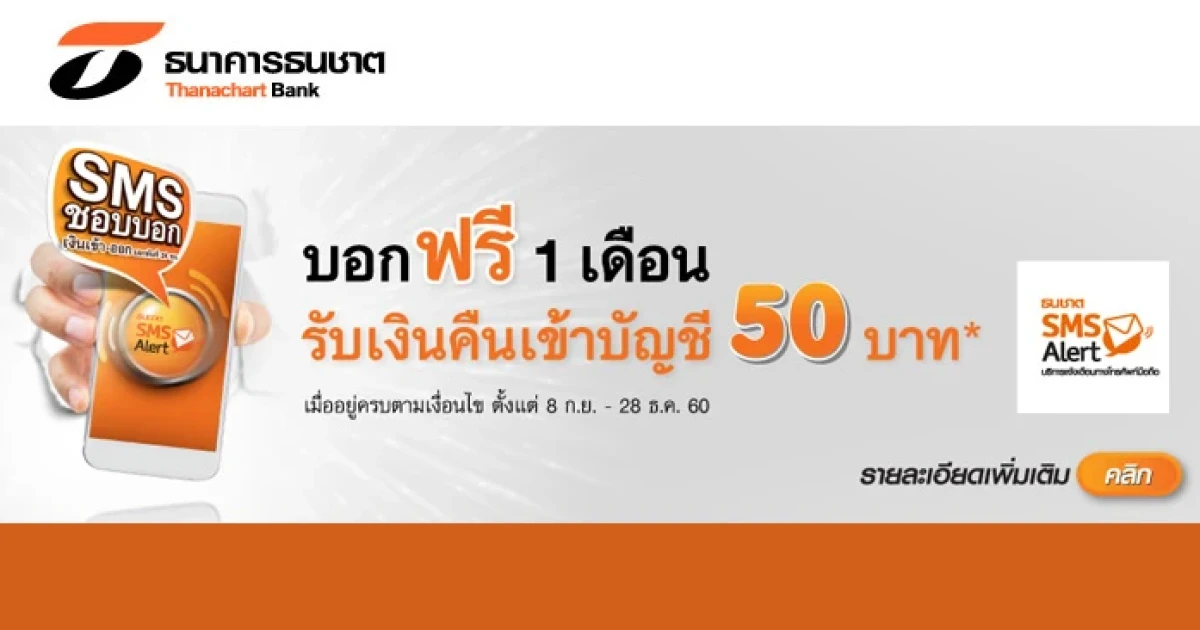 Thanachart SMS Alert ใช้ฟรีเดือนแรก ใช้ต่ออีก 3 เดือน รับ Cash Back เข้าบัญชี 50 บาท