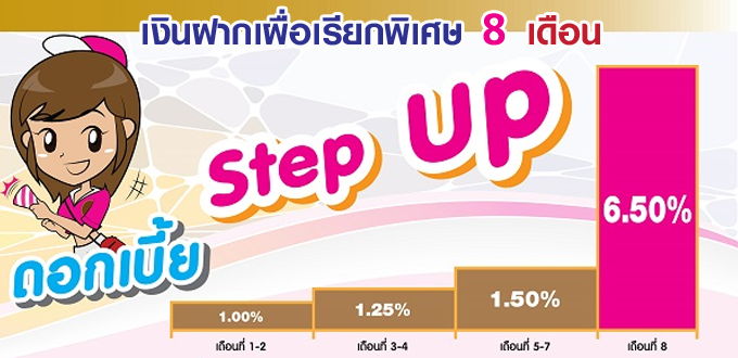 ลูกค้าบุคคลธรรมดา จำนวนเงินตั้งแต่ 10,000 บาท และนิติบุคคล จำนวนเงินตั้งแต่ 10,000 - 50,000,000 บาท รับอัตราดอกเบี้ยแบบ Step Up ดังนี้