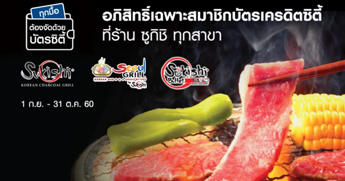 ทุกมื้อต้องจัด ด้วยบัตรเครดิตซิตี้ รับส่วนลดสูงสุด 150 บาท และสิทธิพิเศษเมื่อรับประทานที่ร้านซูกิชิ ทุกสาขา อาทิ ซูกิชิ โคเรียน ชาร์โคล กริลล์, โซลกริลล์ และ ซูกิชิ โตเกียวบุฟเฟ่ต์