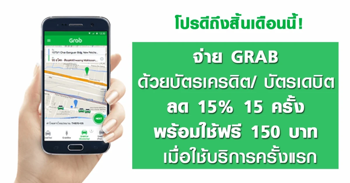 จ่าย Grab ด้วยบัตรเครดิต/ บัตรเดบิต ลด 15% 15 ครั้ง พร้อมใช้ฟรี 150 บาท เมื่อใช้บริการครั้งแรก