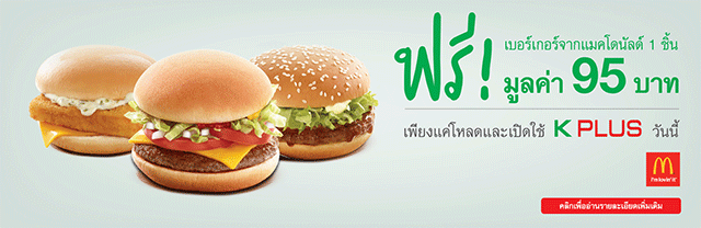 - คูปองนี้สำหรับลูกค้า K PLUS ที่สมัครและทำรายการครั้งแรกจะได้รับฟรี เบอร์เกอร์ 1 ชิ้นมูลค่า 95 บาท เมนูที่ร่วมรายการได้แก่ ดีลักซ์ชีสเบอร์เกอร์ (Deluxe Cheeseburger) แมคฟิช (Filet-O-Fish) และ ซามูไรเบอร์เกอร์หมู (Samurai Pork Burger ) หมดเขตการใช้คูปอง ภายในวันที่ 31 ม.ค.2561
