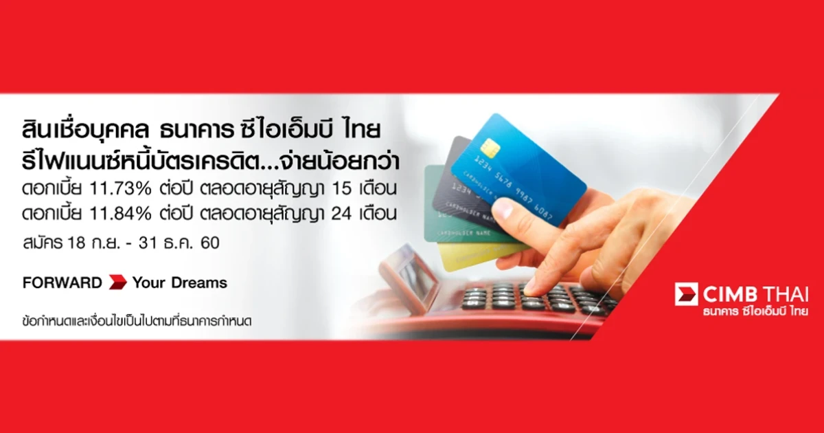 สินเชื่อบุคคล ธนาคารซีไอเอ็มบี ไทย รีไฟแนนซ์หนี้บัตรเครดิต...จ่ายน้อยกว่า