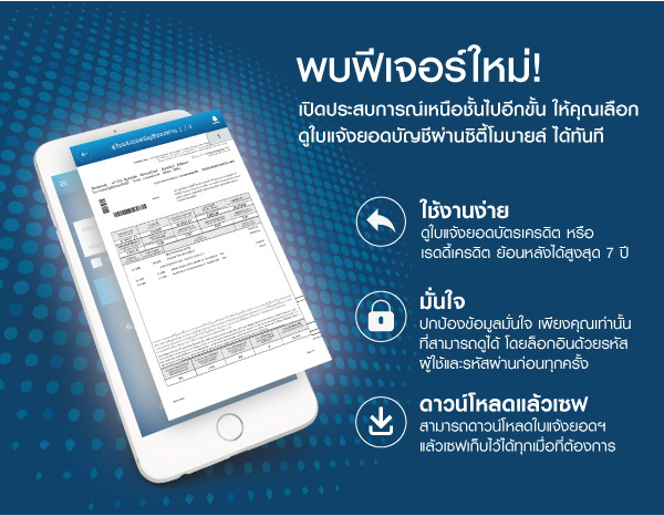 - ใช้งานง่าย ดูใบแจ้งยอดบัตรเครดิต หรือเรดดี้เครดิต ย้อนหลังได้สูงสุด 7 ปี