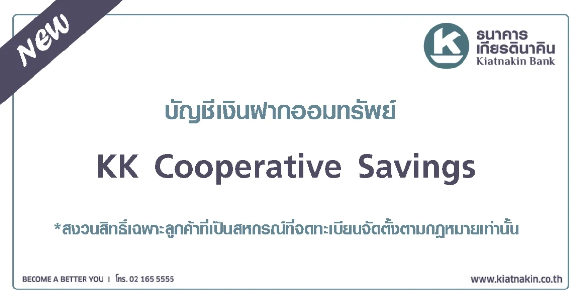 บัญชีเงินฝากออมทรัพย์ KK Cooperative Savings เป็นบัญชีเงินฝากออมทรัพย์สำหรับลูกค้านิติบุคคล สงวนสิทธิ์เฉพาะลูกค้าที่เป็นสหกรณ์ที่จดทะเบียนจัดตั้งตามกฎหมายเท่านั้น