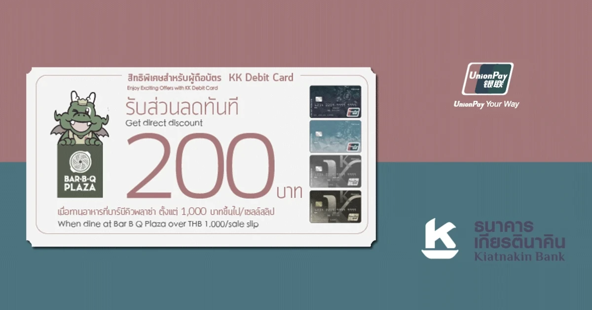 สิทธิพิเศษสำหรับผู้ถือบัตร KK Debit Card UnionPay รับส่วนลด Bar-B-Q PLAZA ทันที 200 บาท*