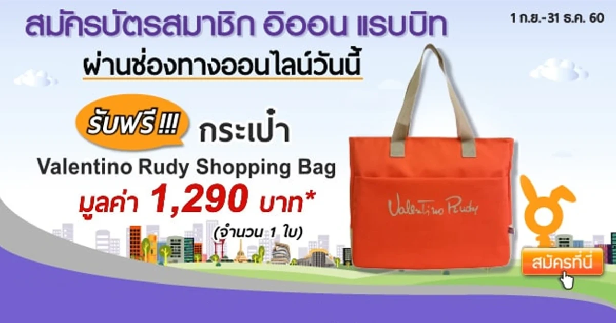 - รับฟรี กระเป๋า Valentino Rudy Shopping Bag 1 ใบ มูลค่า 1,290 บาท เมื่อสมัครบัตรสมาชิก อิออนแรบบิท ผ่านช่องทางออนไลน์ระหว่างวันที่ 1 กันยายน 2017? 31 ธันวาคม 2017 และ ได้รับการอนุมัติบัตร เท่านั้น