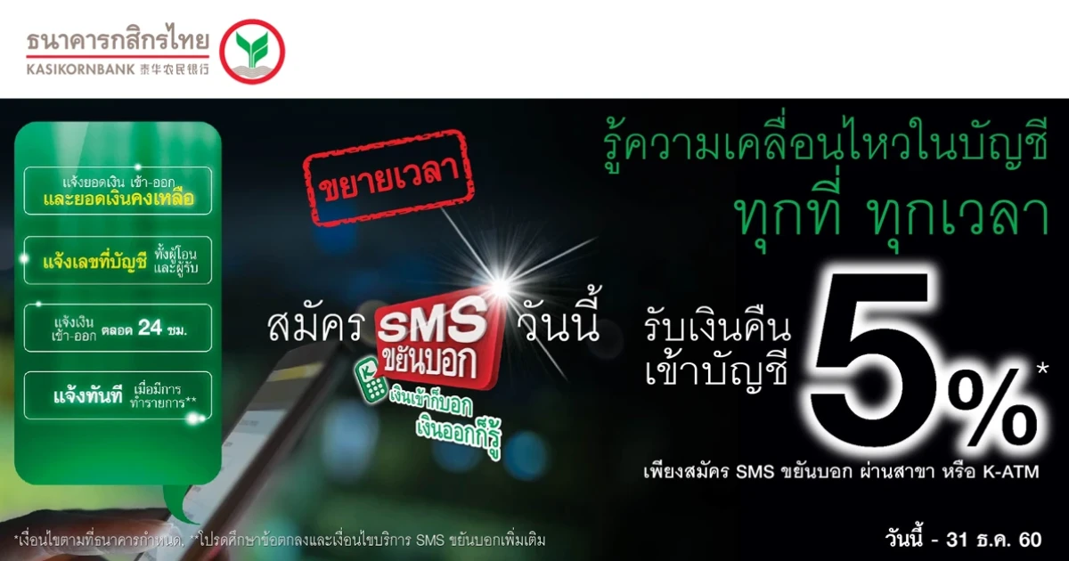 - สิทธิพิเศษรับเงินคืนเข้าบัญชี 5% หรือ 11 บาท เฉพาะลูกค้าที่สมัครบริการ SMS ขยันบอกแบบรายปี ผ่านสาขาธนาคารกสิกรไทยทั่วประเทศ และ ผ่านตู้ K-ATM ภายในระยะเวลาส่งเสริมการขายเท่านั้น