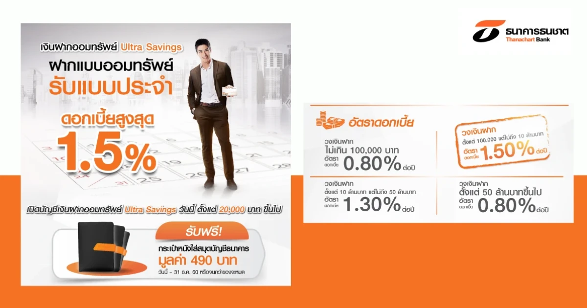 เงินฝากออมทรัพย์ Ultra Savings ฝากแบบออมทรัพย์รับแบบประจำ ดอกเบี้ยสูงสุด 1.50%