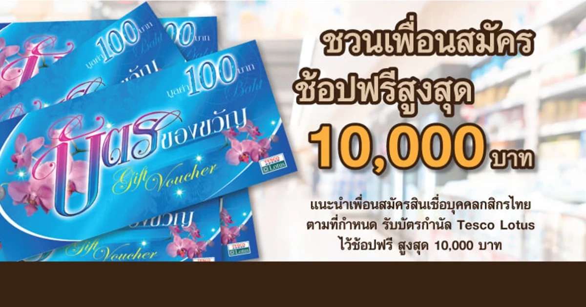 ชวนเพื่อนสมัครสินเชื่อบุคคลกสิกรไทย รับบัตรกำนัล Tesco Lotus ไว้ช้อปฟรี สูงสุด 10,000 บาท