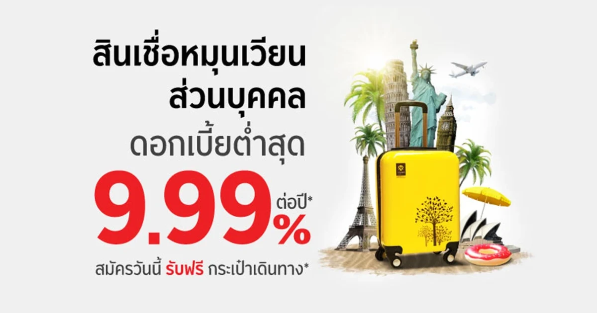 สินเชื่อหมุนเวียนส่วนบุคคลดอกเบี้ยต่ำสุด 9.99% ต่อปี จาก ธ.กรุงศรีฯ สมัครวันนี้ รับฟรี! กระเป๋าเดินทาง
