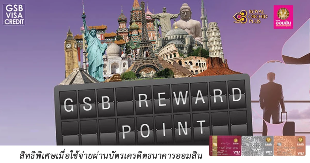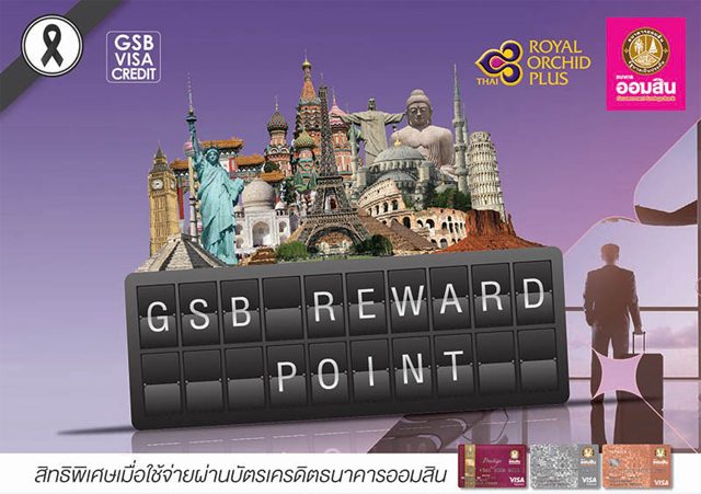 สิทธิพิเศษสำหรับลูกค้าบัตรเครดิตธนาคารออมสิน ให้คุณแลกรับไมล์สะสม รอยัล ออร์คิด พลัส ได้ง่ายขึ้น เพื่อแลกรางวัลบัตรโดยสารการบินไทย สู่จุดหมายปลายทางทั่วโลก โดยทุกการใช้จ่าย 25 บาท จะได้รับ 1 คะแนน GSB Reward Point