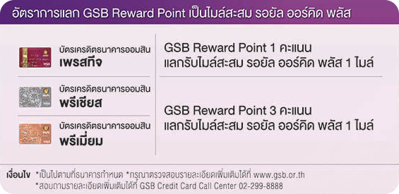 - บัตรเครดิตธนาคารออมสิน พรีเชียส และ บัตรเครดิตธนาคารออมสิน พรีเมี่ยม : GSB Reward Point 3 คะแนน แลกรับไมล์สะสม ROP 1 ไมล์