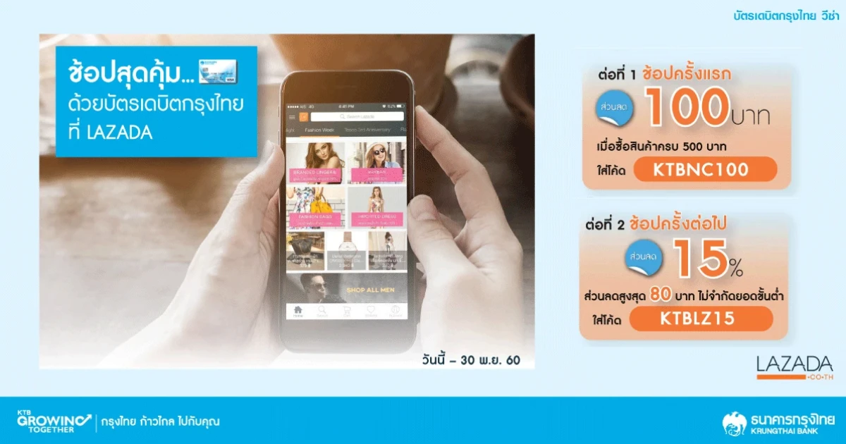 ช้อปด้วยบัตรเดบิตกรุงไทย ที่ LAZADA ให้ส่วนลดสุดคุ้ม 2 ต่อ