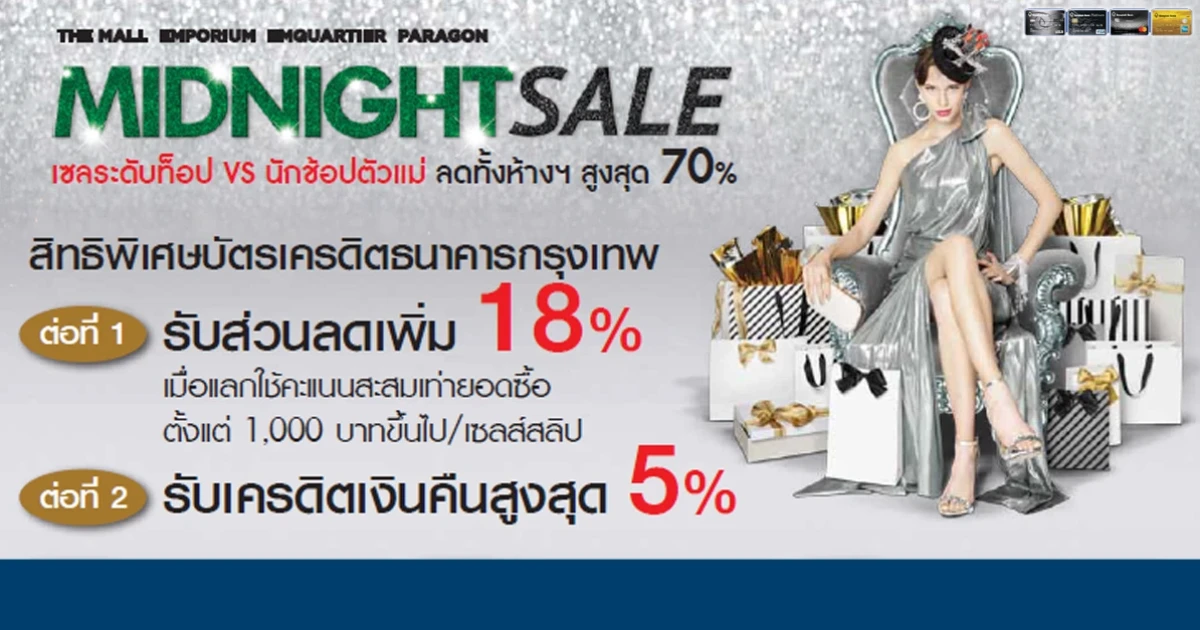 MIDNIGHT SALE เซลระดับท็อป VS นักช้อปตัวแม่ ลดทั้งห้างฯ สูงสุด 70% พร้อมรับเครดิตเงินคืนสูงสุด 5% เมื่อช้อปที่ห้างฯ ที่ร่วมรายการ อาทิ The Mall, Emporium, Emquartier, Paragon และ Bluport สิทธิพิเศษจากบัตรเครดิตธนาคารกรุงเทพ