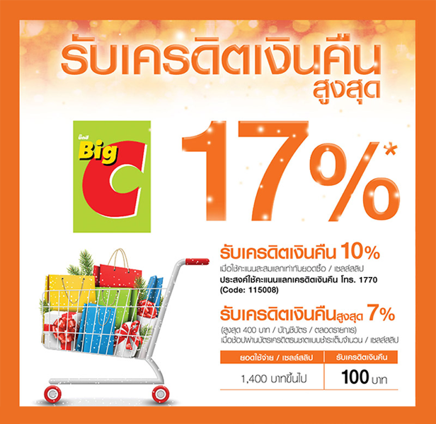 รับเครดิตเงินคืนสูงสุด 17% เมื่อมียอดใช้จ่ายที่ Big C ทุกสาขาที่ร่วมรายการ อาทิ Big C, Mini Big C, Big C Supercenter, Big C Extra, Big C Market (ยกเว้นรายการจาก www.bigc.co.th) ผ่านบัตรเครดิตธนชาต