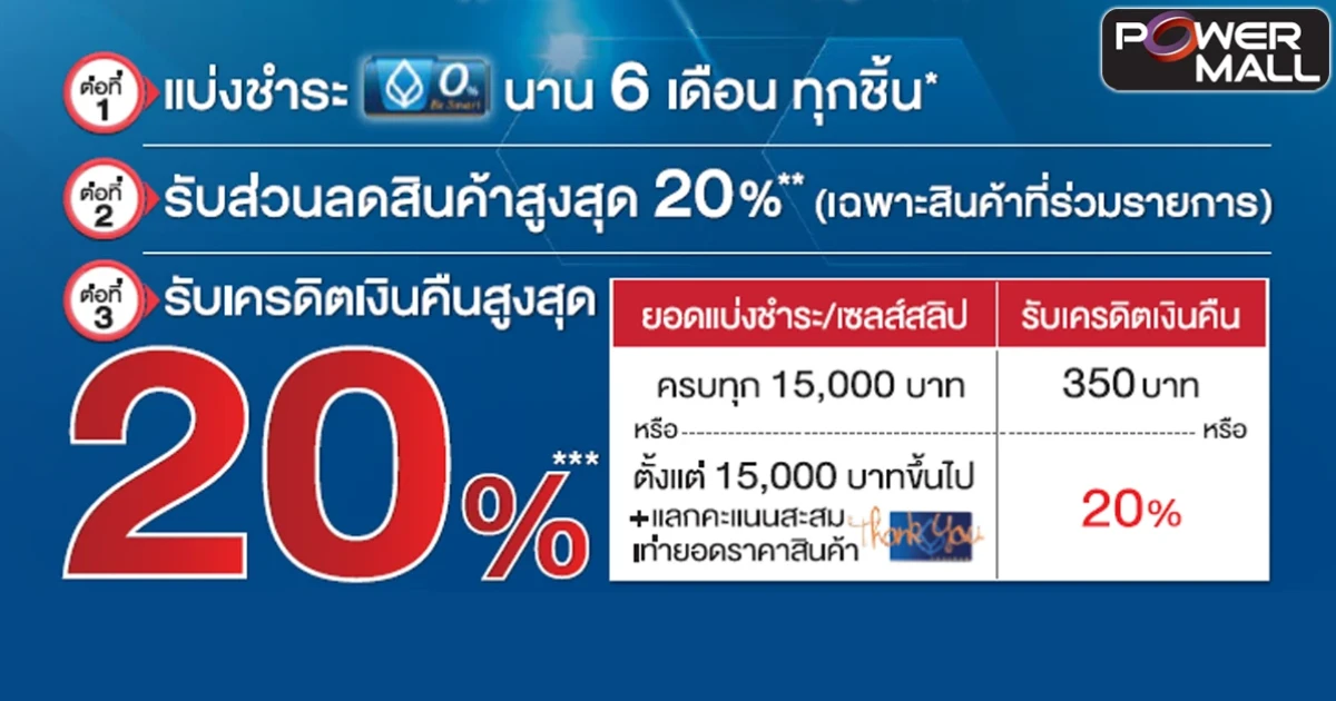 แบ่งชำระ 0% 6 เดือน พร้อมรับส่วนลดและเงินคืนสูงสุด 20% ที่ Power Mall จากบัตรเครดิตธนาคารกรุงเทพ
