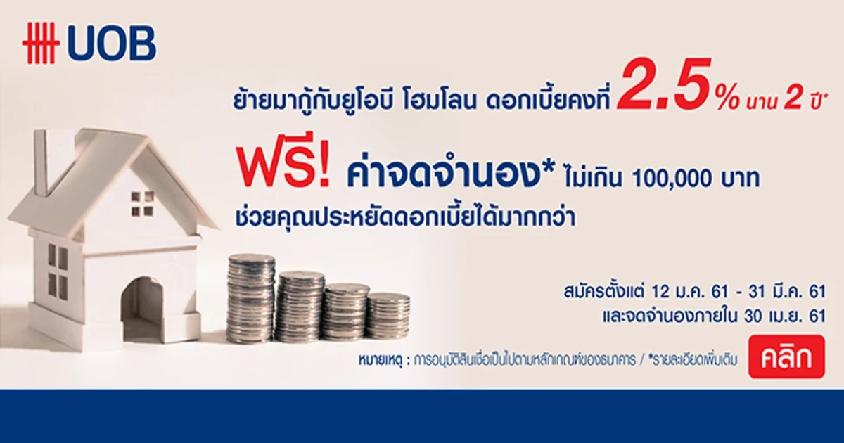 ย้ายมากู้กับยูโอบี โฮมโลน ดอกเบี้ยคงที่ 2.50% นาน 2 ปี ฟรี! ค่าจดจำนองไม่เกิน 100,000 บาท