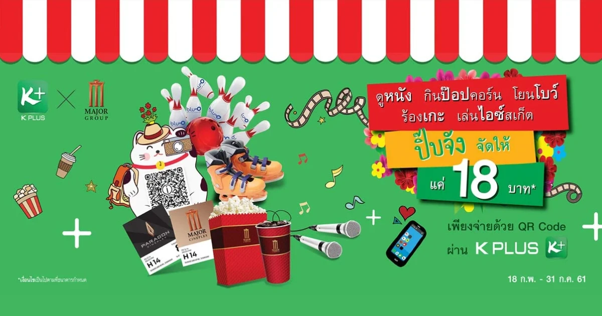 ธนาคารกสิกรไทย ร่วมกับ บริษัท เมเจอร์ ซีนีเพล็กซ์ กรุ้ป จำกัด (มหาชน) และบริษัท เมเจอร์ โบว์ล กรุ้ป จำกัด จัดโปรโมชั่นสุดแรงสำหรับลูกค้า K PLUS ที่ชำระเงินผ่าน QR Code สามารถซื้อตั๋วหนัง ชุดป๊อปคอร์นพร้อมเครื่องดื่ม ร้องคาราโอเกะ โยนโบว์ลิ่ง หรือเล่นไอซ์สเก็ต ในราคาสุดพิเศษจ่ายแค่ 18 บาท โดยกดแลกรับสิทธิ์ได้ที่เมนู Reward PLUS สิทธิ์มีจำนวนจำกัด ใช้ได้ที่เมเจอร์ ซีนีเพล็กซ์ กรุ้ป 24 สาขา และบลูโอ ซับซีโร่ ทุกสาขา ลูกค้าสามารถรับโค้ด 1 สิทธิ์ต่อรายการต่อเดือน