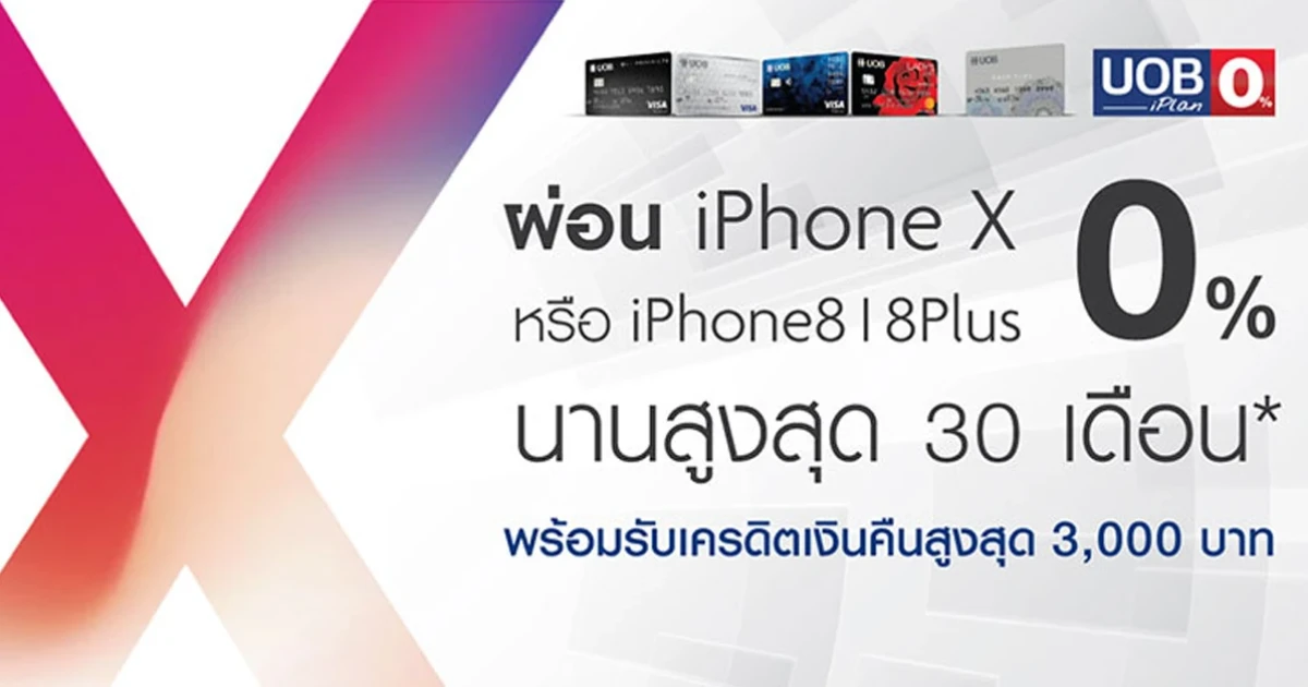 ผ่อน iPhone X หรือ iPhone8/8Plus 0% นาน 30 เดือน พร้อมรับเครดิตเงินคืน จาก ธ.ยูโอบี