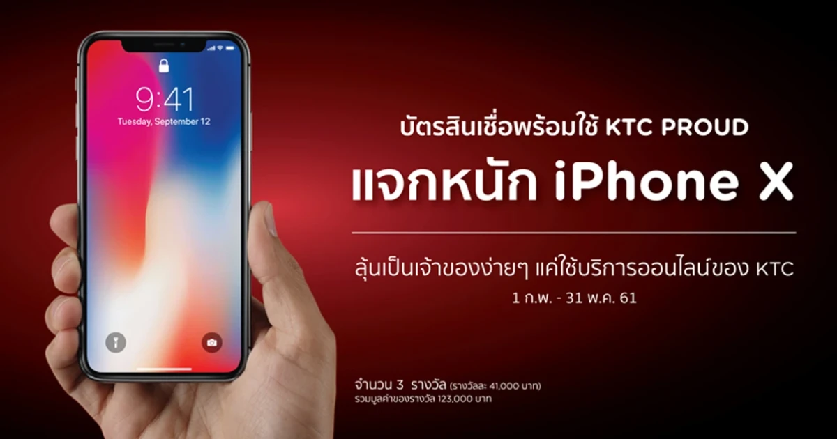 บัตรสินเชื่อพร้อมใช้ KTC PROUD แจกหนัก iPhone X 64GB จำนวน 3 รางวัล (รางวัลละ 41,000 บาท) รวมมูลค่าของรางวัล 123,000 บาท