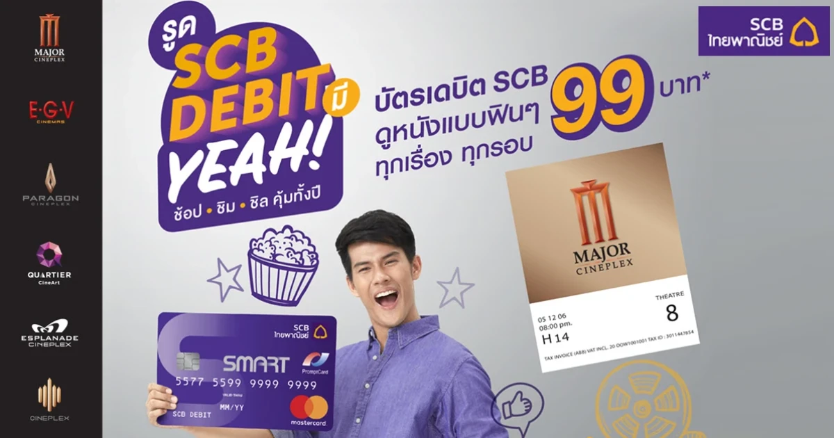 บัตรเดบิต SCB ดี๊ดี.. ดูหนังแบบฟินๆ ได้ในราคาพิเศษเพียง 99 บาทเท่านั้น จากราคาปกติ 260 บาท ทุกเรื่อง ทุกรอบ ที่โรงภาพยนตร์ในเครือ Major Cineplex Group อาทิ Major Cineplex, EGV, Paragon Cineplex, Quartier CineArt (สงวนสิทธิ์ 2 ที่นั่ง/ บัตร/ เดือน)