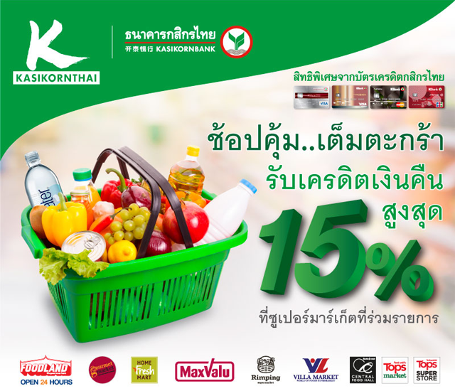 ช้อปคุ้ม.. เต็มตะกร้า รับเครดิตเงินคืนสูงสุด 15% ณ ซูเปอร์มาร์เก็ตที่ร่วมรายการ อาทิ Foodland, Gourmet Market, Home Fresh Mart, Maxvalu, Central Food Hall, Tops Market จากบัตรเครดิตกสิกรไทย