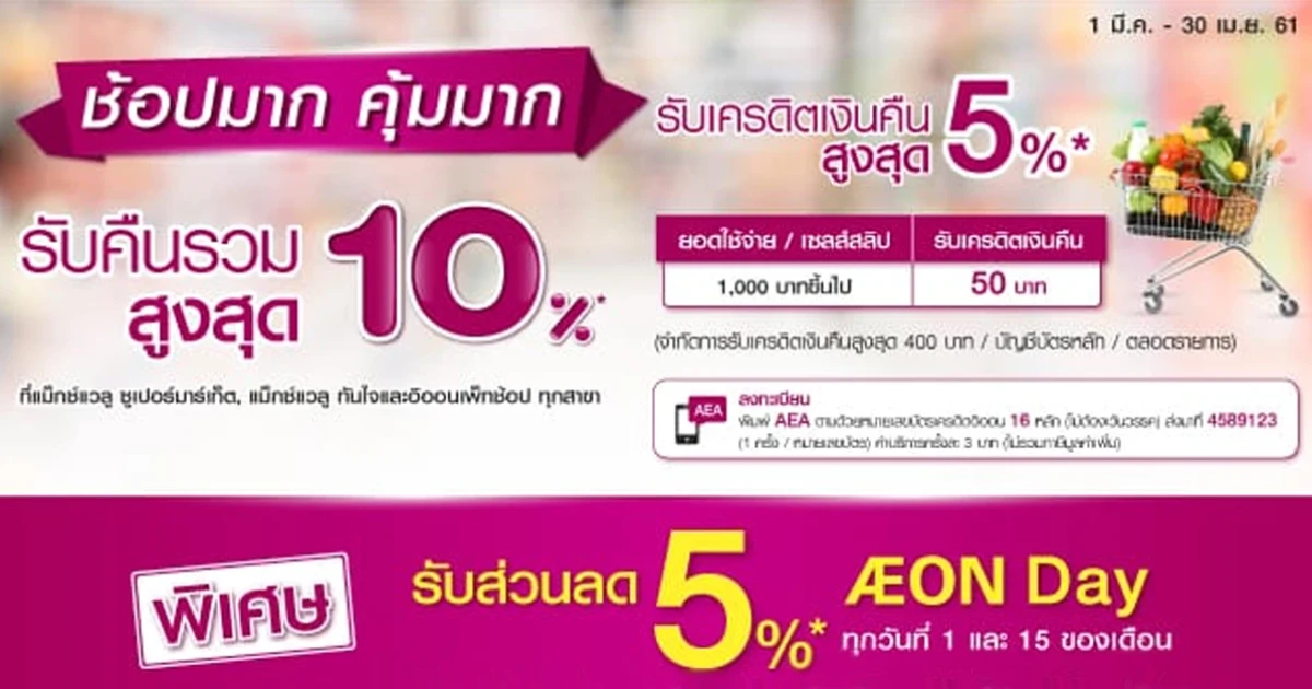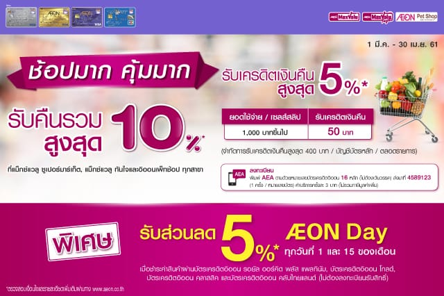 ต่อที่ 2 : รับส่วนลด 5% AEON Day ทุกวันที่ 1 และ 15 ของเดือน เมื่อชำระค่าสินค้าผ่านบัตรเครดิตอิออน รอยัล ออร์คิด พลัส แพลทินัม บัตรเครดิตอิออนโกลด์ บัตรเครดิตอิออนคลาสสิค และบัตรเครดิตคลับไทยแลนด์
