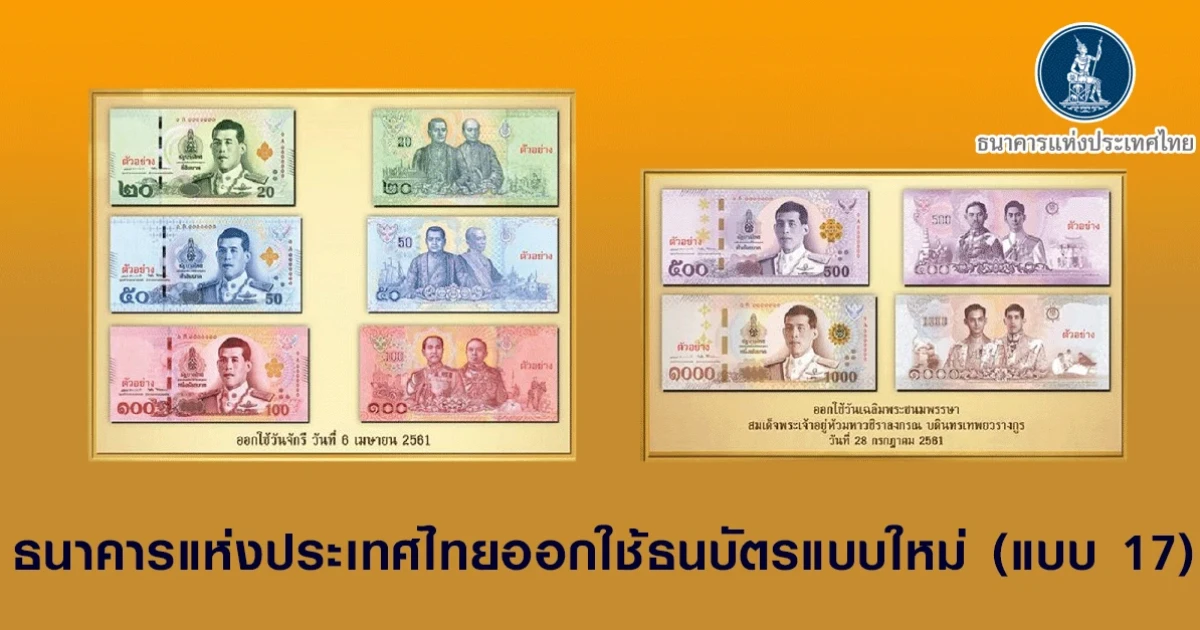 ธนาคารแห่งประเทศไทยออกใช้ธนบัตรแบบใหม่ (แบบ 17) กำหนดออกใช้ในวันจักรี 6 เมษายน 2561