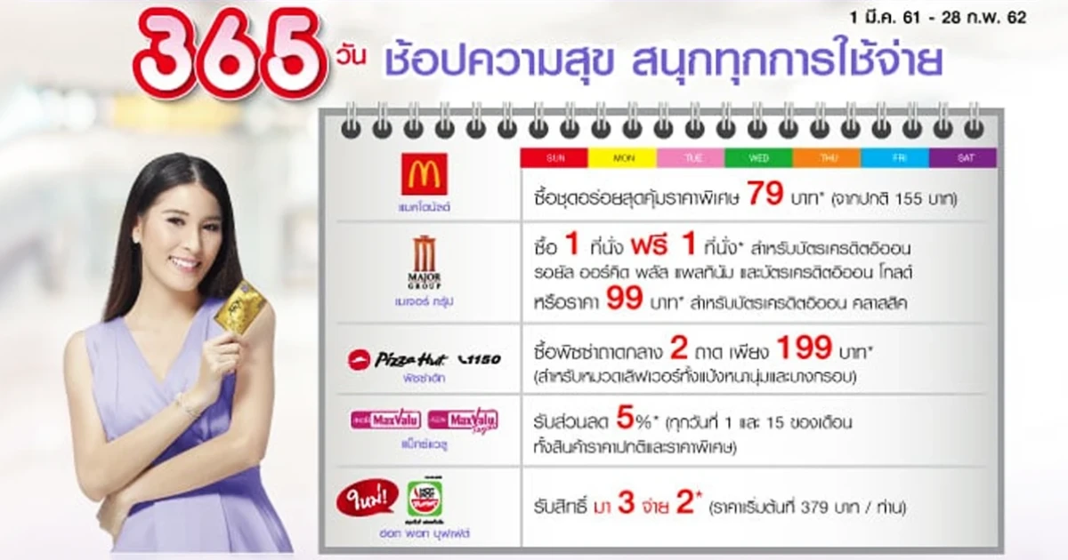 365 วัน ช้อปความสุข สนุกทุกการใช้จ่าย ณ ร้านค้าชั้นนำ อาทิ ร้านแมคโดนัลด์, ร้านพิซซ่า ฮัท, ร้านฮอท พอท บุฟเฟ่ต์, โรงภาพยนตร์ในเครือเมเจอร์ ซีนีเพล็กซ์, แม็กซ์แวลู ซูเปอร์มาร์เก็ต และแม็กซ์แวลู ทันใจ สิทธิพิเศษจากบัตรเครดิตอิออน