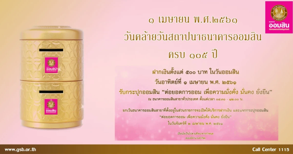 รับกระปุกออมสิน "ต่อยอดการออม เพื่อความมั่งคั่ง มั่นคง ยั่งยืน" เมื่อฝากเงินตั้งแต่ 500 บาท ในวันออมสิน (วันอาทิตย์ที่ 1 เมษายน พ.ศ.2561) ณ ธนาคารออมสินสาขาทั่วประเทศ ตั้งแต่เวลา 08.30 - 12.00 น. ยกเว้น ธนาคารออมสินสาขาที่ตั้งอยู่ในส่วนราชการจะเปิดให้บริการฝากเงิน และแจกกระปุกออมสิน ในวันจันทร์ที่ 2 เมษายน พ.ศ. 2561