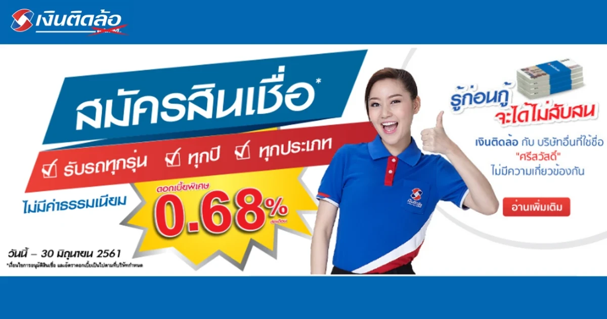 สมัครสินเชื่อจำนำทะเบียนรถ ที่เงินติดล้อ ไม่มีค่าธรรมเนียม ดอกเบี้ยถูก 0.68% ต่อเดือน